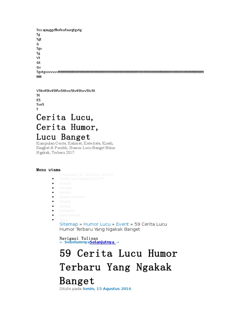 Kumpulan cerita lucu pendek terbaru anda penggemar cerita lucu. Kumpulan cerita humor lucu banget tentang seks ini sudah melewati uji standar kelayakan ngakak dan konyol minimum yang disyaratkan oleh pemerintah jadi dijamin berkualitas dan bikin ngakak. Berikut ini ada banyak cerita lucu banget bikin ngakak mulai dari mukidi abu nawas sampai cerita dewasa suami istri.
